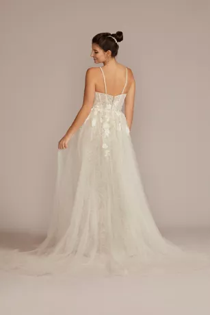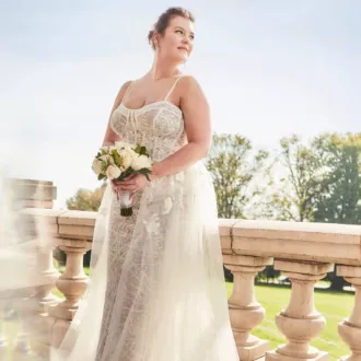 Make your guests do a double-take when you switch up your lace bridal look with a detachable embellished tulle overskirt. The enticing corset-like boning at the bodice enhances the sleek lines of the sheath silhouette, poised gently with the charming sweetheart neckline.