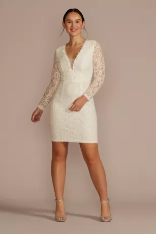 Rock the courthouse ceremony or wow at your pre-wedding events in this short allover lace dress. An illusion V-neckline and a back slit amp up the allure, while charming long sleeves complete the look.