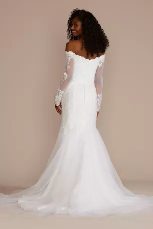 The beauty is in the details of this long sleeve lace and tulle mermaid dress. The off-the-shoulder neckline dips into a flattering V while clear sequins provide subtle sparkle.Â