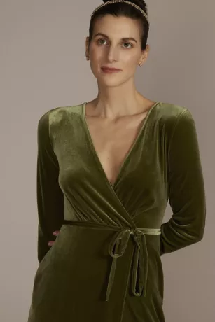 Sumptuously soft, this long-sleeve faux-wrap velvet bridesmaid dress is a clear winner for cool-weather celebrations.