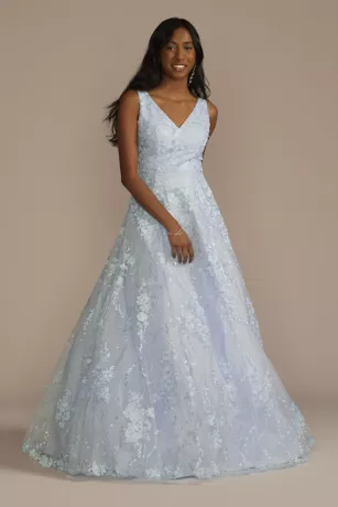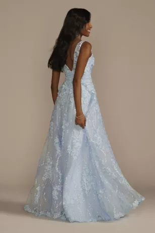 Bring your sweet dreams to life with this whimsical ball gown’s 3D floral appliques, flecks of glitter, and voluminous skirt. Top off your prom look with your best accessories.