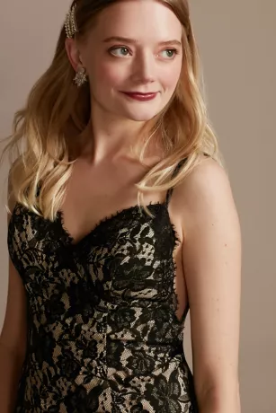 This form fitting and figure flattering eyelash lace sheath dress swoops low at the back, as a lace train trails weightlessly behind. Â