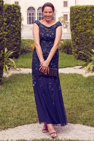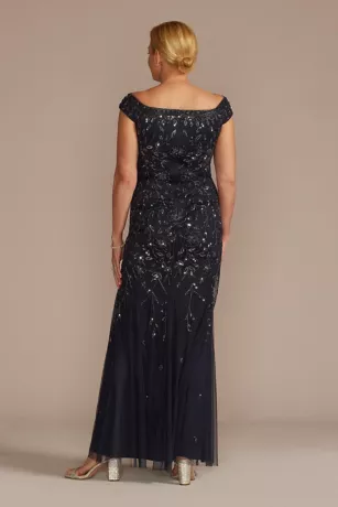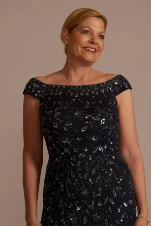 Debut once-in-a-lifetime extravagance in this off-the-shoulder gown, beautifully beaded with opulent details through the bodice and finished with a voluminous godet skirt.
