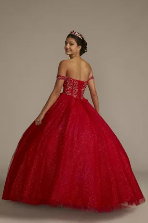 Celebra tus quince anos con estilo! A beautifully beaded bodice with off-the-shoulder sleeves sits atop the full ball gown skirt of your dreams. Glitter tulle will have you feeling like a princess as you twirl across the floor throughout your day.