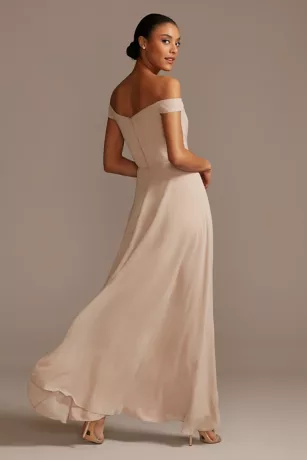 This long chiffon bridesmaid dress gives an aura of dreamy romance from the pleated off-the-shoulder neckline to the full circle skirt.Â