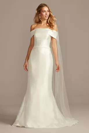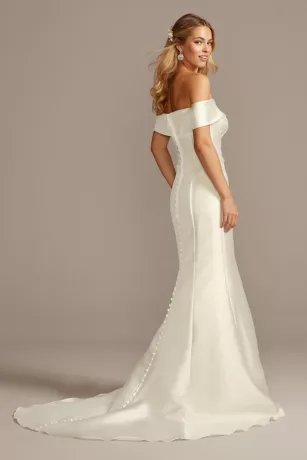 A crisp and classic look for the traditional bride with a fashion-forward streak, this mikado trumpet gown features an off-the-shoulder cuff neckline and back button detail that goes from the neckline to the end of the train.