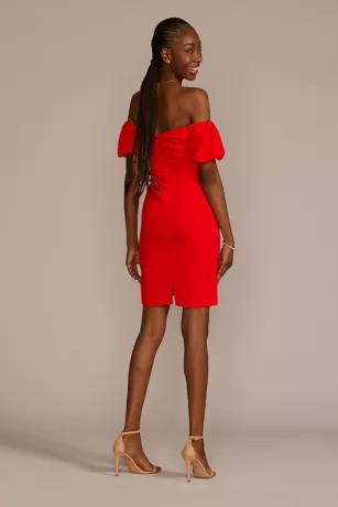 Dramatic puff sleeves shape this off-the-shoulder midi dress into a one-of-a-kind look. The formfitting silhouette brings the heat!