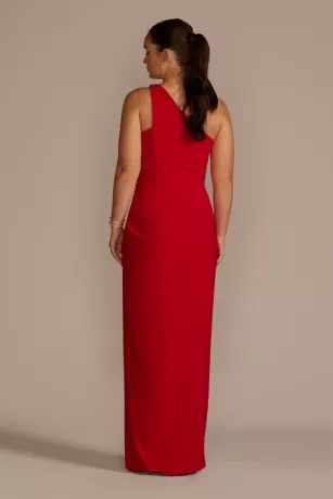 Stretchy crepe fabric gives this one-shoulder dress bonus party points for allowing you to move and groove all night long! Ruched detailing and a skirt slit finishes the look.