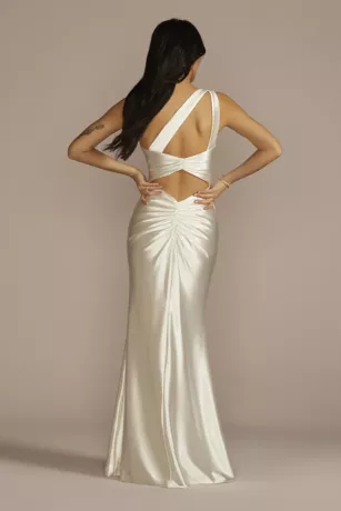 Crafted of lustrous satin, this sexy sheath wedding dress is full of wow-worthy details like a one-shoulder neckline, a strappy back, and a ruched cutout waist.