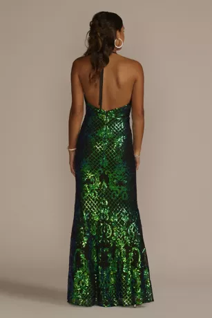 A glistening pattern of sequins add undeniably sexy shine to this sheath dress styled with a dramatic plunging halter neckline. If a bombshell prom look is what you’re after, this is it!