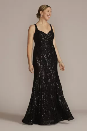 Catch light and attention in this sequin-adorned mermaid gown. A flirty lace-up back detail completes the look.