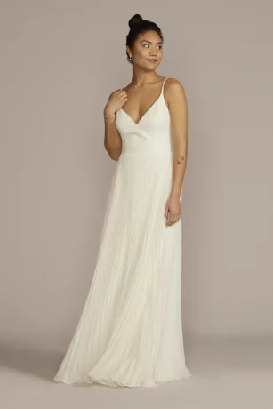 A modern pleated skirt elevates the classic A-line silhouette. Spaghetti straps and a deep V-neckline are as seductive as they are sweet and pair beautifully with the artful piping on the waistline.