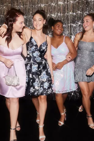 This short A-line dress features light-catching metallic brocade flowers, a plunging V-neckline, handy pockets, and a full pleated skirt made for twirling. With your best pair of heels, this look is perfect for homecoming.