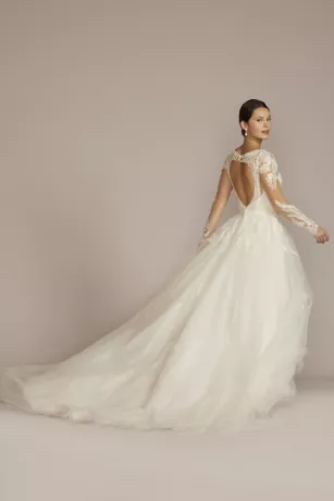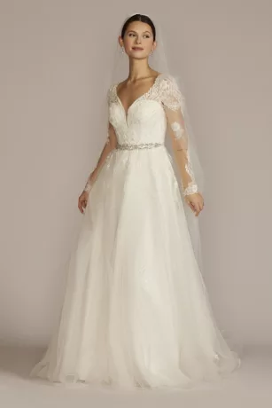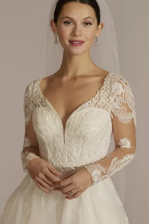 Get ready for a romantic walk down the aisle in this dreamy beaded A-line tulle dress featuring two types of lace appliques on the bodice, long sleeves, and a beautiful open back. The plunging V-neckline completes the look with a hint of drama.