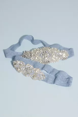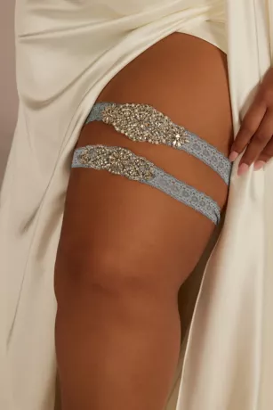 Gorgeously encrusted with twinkling pave crystals, this garter adds a pretty touch to your wedding accessories. A no-slip grip keeps your garter in place. Set includes a scaled-down version for tossing at the reception.