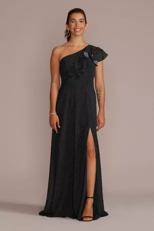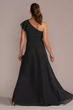 Polka dots are always a good idea! The playful pattern covers this party dress, from the voluminous statement ruffle sleeve through the thigh-high skirt slit, turning a classic A-line into anything but.