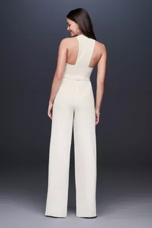 A chic look for a modern wedding or any wedding event, this flattering draped crepe jumpsuit features a crystal-embellished rose gold belt and a sleek, angular racerback.