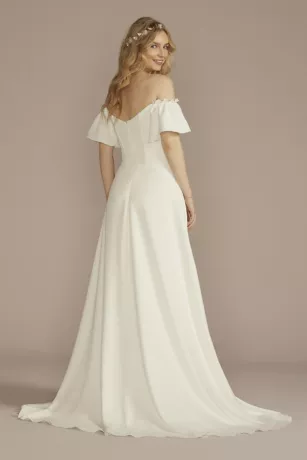 Thoughtfully designed with recycled crepe fabric, this wedding dress is perfect for the boho bride. Off-the-shoulder ruffle sleeves add fun dimension to the fitted corset bodice, while a skirt slit brings a sexy touch. A pretty sash defines the waist and ties the whole look together.
