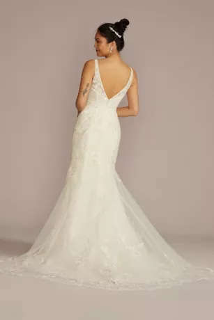 Switch up your look from the aisle to the after party with a detachable extended train. Decorated with three different kinds of lace appliques, this exquisite wedding dress exudes bridal elegance with ease. Tank sleeves and a plunging neckline add allure while the mermaid silhouette beautifully skims your curves.