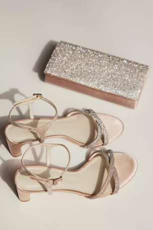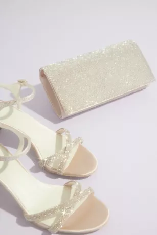 This satin clutch is topped with an array of rhinestones so sparkly you’ll be in the spotlight with every step! It features a removable chain strap and a flap-front closure.