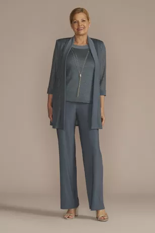 A beautiful choice for any grandmother or mother of the bride or groom, this pantsuit combines elegance with ease thanks to a no-fuss metallic shirt jacket and straight leg knit pants. Plus, a dazzling attached necklace makes accessorizing a breeze!