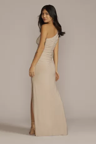As glamorous as it is comfy, this ruched jersey bridesmaid dress combines a one-shoulder neckline with a chic sheath skirt with side slit.