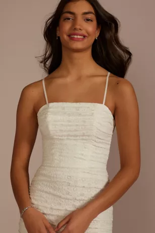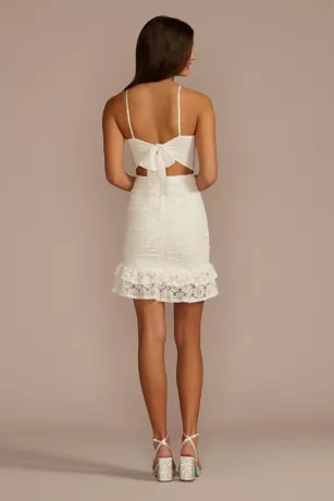 Delicate lace adds lovely texture to this sweet mini dress, from the straight neckline to the ruffled hem skirt. Ace graduation style with your best accessories.