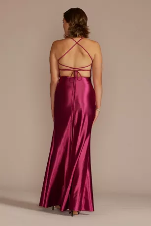 Sleek and slinky, this stretch satin sheath gown shines bright for homecoming or prom.