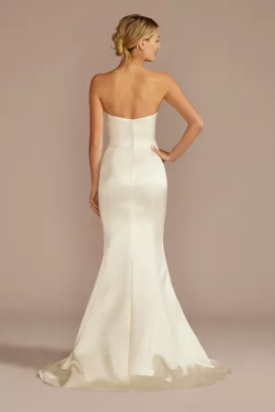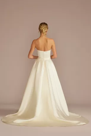 Get swept away in the romance of your big day in a shining satin wedding gown. A soft sweetheart neckline accentuates meticulous bodice ruching atop a sheath skirt. Craving more drama? A removable overskirt adds volume and allows you to switch up your look from the aisle to the dancefloor.