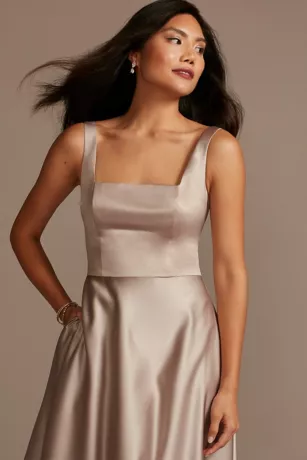 A satin bridesmaid dress that photographs beautifully, this square-neck tank style is a classic for good reason. Features side pockets.