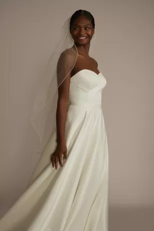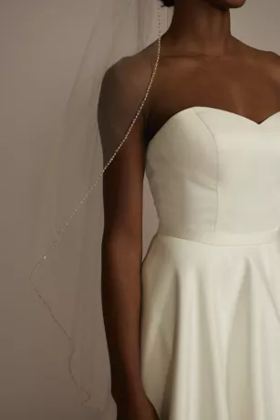 This mid-length veil puts a modern spin on bridal style with an airy layer of tulle detailed with tiny sequins and beads around the edge.