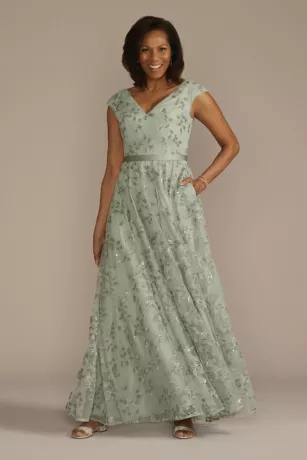 Shimmering sequins define this floral patterned A-line dress designed with cap sleeves and a flattering V-neckline. Mom will love every last detail, from the waist accent to the skirt pockets.