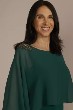 Featuring embellishments at the shoulders, a wispy chiffon capelet drapes over this sophisticated jersey sheath dress, providing beautiful coverage for any mother of the bride or groom.