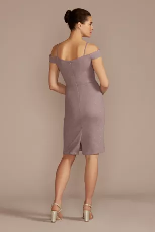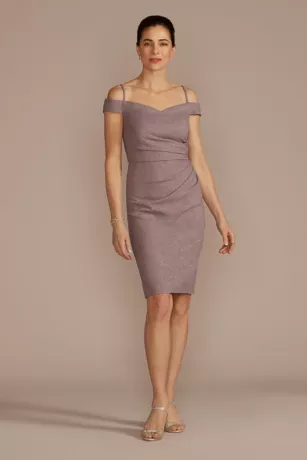 Mom will shine from the inside out when she wears this glitter knit sheath dress. Designed to hug her figure, gathered fabric is accented by light-catching buttons, while the off-the-shoulder sweetheart neckline shows off her romantic side.