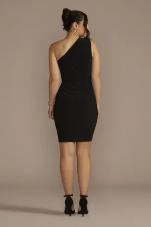 Sleek stretch jersey fabric shapes this party-ready short sheath just begging to be worn on your next night out. The one-shoulder neckline perfectly balances a subtle skirt slit for a look that’s classically sexy.