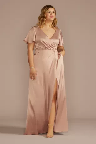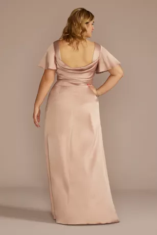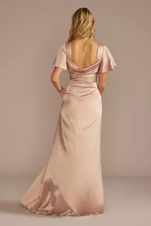 Made of silky, satiny stretch charmeuse fabric, this A-line bridesmaid dress is full of gorgeous details: flutter sleeves, a cowl back, handy pockets, and a skirt slit.