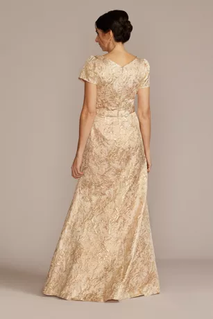 Eye-catching gold metallic tones illuminate this short sleeve jacquard gown. Together, the sheath silhouette and waist detail highlight your curves