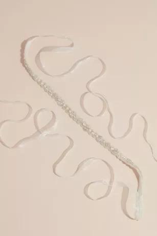 Add some shimmer to your wedding day look with this slender sash, crafted of crystals and rhodium and tied with a pretty ribbon.