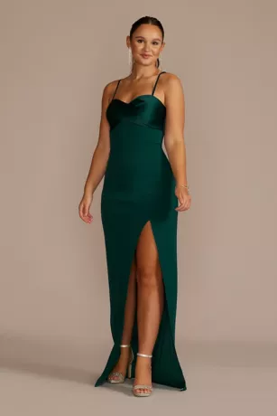 Mixed materials have never come together so perfectly to create such a cohesive piece. This long sheath features a stretch crepe slit-accented skirt and a gorgeous satin bodice.
