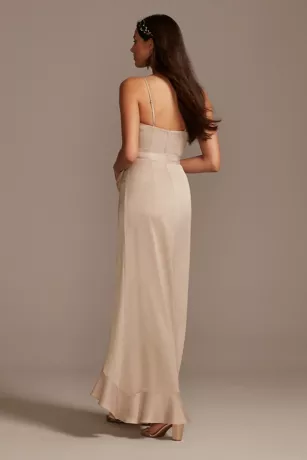 Crafted of crepe-back satin, this bridesmaid dress has a luminous shine from the spaghetti-strap neckline to the ruffled skirt hem. A tie at the waist adds the finishing touch.Â