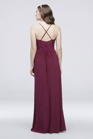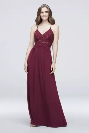 Sequins and lace adorn the bodice of this stretch jersey sheath dress, while crisscross spaghetti straps add interest at the back.Â