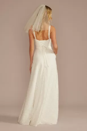 Make the aisle your runway in a dazzling corset bodice wedding dress. Allover sparkle lace catches the light with every twirl of the A-line skirt, and a lace-up back adds a sexy charm.
