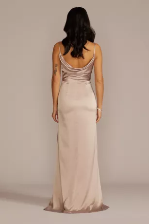 All the glamour you could want in a bridesmaid dress: satin-like charmeuse fabric, a surplice V-neck bodice, and the prettiest cowl back.
