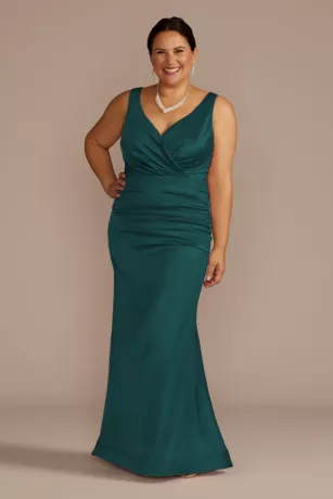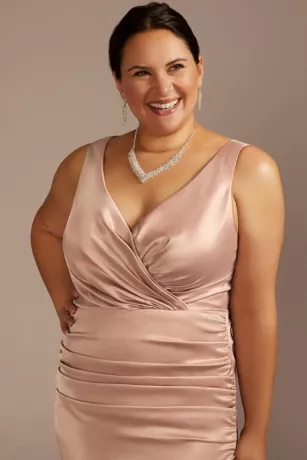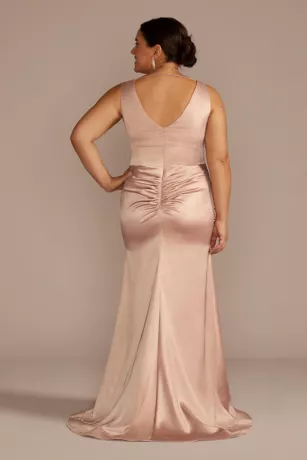 With a glam silhouette, a gorgeous V-neckline, and stretch satin fabric, this bridesmaid dress is truly the one to shine in. Horsehair trim adds definition to the dramatic mermaid skirt, complete with a chapel train.