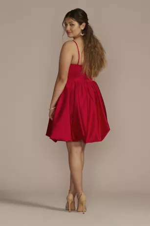 A modern bubble-hem skirt gives this short, satin A-line dress a flirty finish. Stash all your homecoming essentials in the handy pockets.