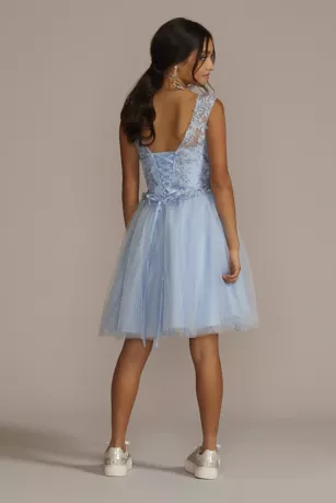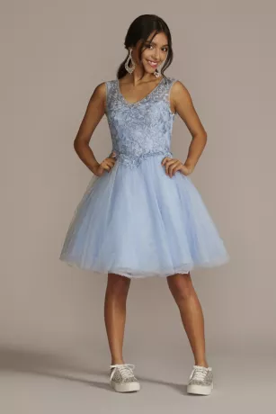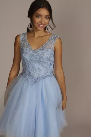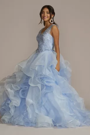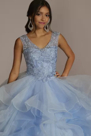 Que hermosa! Make your quince an unforgettable event with this stunning lace-up transformer gown. A detachable ruffled overskirt sits atop a short, lace embellished dress for the ultimate mid-party reveal.